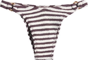 These striped bikini bottoms with tortoise-colored side rings can be worn low, mid or high on the hip to suit your style.