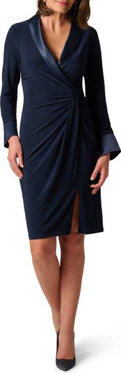 Satin accents add a tuxedo touch to a chic sheath offered in soft crepe.
