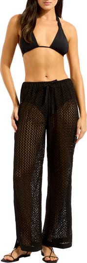 Take a break from the water in comfy but chic open-knit pants designed with adjustable drawstring ties at the waist.