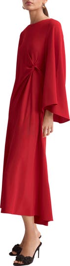 Draped sleeves and a knotted side add soft sculpture to a striking dress offered in a siren shade.