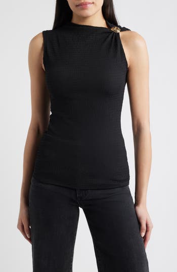 Soft texture and a kiss of stretch enhance the close fit of this sleeveless top made with a twisted high neckline and a sleek golden embellishment.