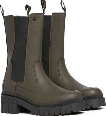 Rubber-coated leather brings sleek, weather-ready comfort to a Chelsea boot designed with a tall shaft for extended protection and deep goring panels for easy on and off. It sits on a chunky rubber sole molded with all-direction lugs to put traction and confidence under every step.