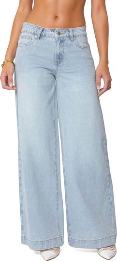 Mix casual and elevated in these low-rise wide-leg jeans featuring a light wash, lace-up back pockets and trouser-style hems.