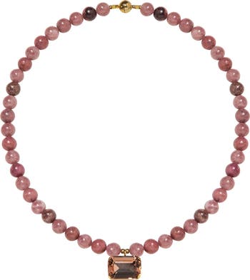 Hand-carved stones line this beaded necklace with vibrant color, while an Austrian crystals centers it with shine.