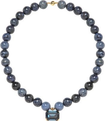 Hand-carved stones line this beaded necklace with vibrant color, while an Austrian crystals centers it with shine.