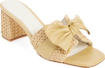 Artfully woven faux raffia emphasizes the resort-ready vibe of this squared-toe sandal centered with a dramatically oversized leather bow.