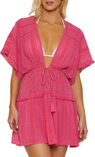 Lace panels and eyelet embroidered details embellish a breezy cover-up with tassel-trimmed ties at the front.