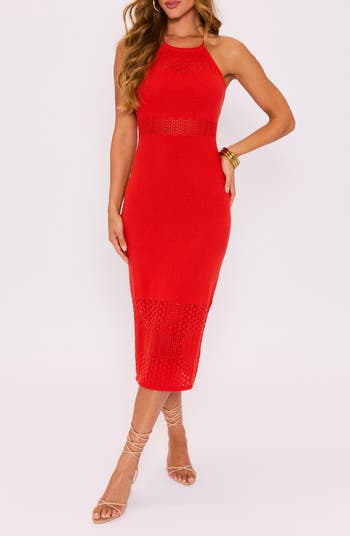 Make a sultry statement in this figure-skimming midi designed with a halter-inspired neck that ties at the back and a mix of open stitches in a fiery red hue.