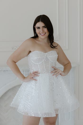 The sparkle of Amalfi, reimagined with a twirl. Meet Siena — our princess-cut sister to the best-selling Amalfi Mini. Designed with an A-line silhouette, hand-beaded shimmer, and just the right amount of flirt, she’s made for dancing through your rehearsal dinner, bridal shower, or after party in full main-character mode. Add strappy heels and the matching neck scarf!