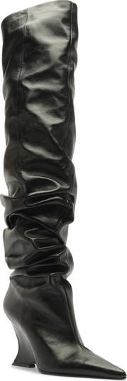 Show up and show out wherever you go in this ruched leather over-the-knee boot balanced by a pointy toe and sculptural wedge heel.