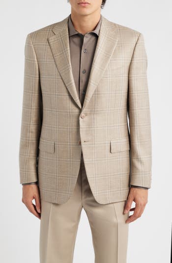 A subtly textured blend of wool, silk and linen patterned in a check of neutral tans and creams brings all-season versatility to a sport coat tailored with clean lines supported by light padding in the shoulders. Styled with traditional notched lapels and lightly fitted in the waist, it adds a smart silhouette to any semiformal or warm-weather look.