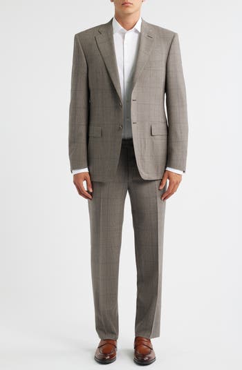 Lightweight, crease-resistant wool patterned in an earthy glen plaid brings all-season distinction to a suit styled with a structured jacket that's fitted in the waist for a streamlined, formal look. The flat-front trousers complement the traditional detailing to keep the silhouette crisp and clean.