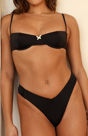 If you’re looking to show a bit more skin on your next getaway, these thong-style bikini bottoms feature the cutest cinched side details and a mini bow at the center. Pair with our matching Feyre Top.