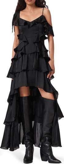 Step into your own fairytale with this enchanting dress, where cascades of ruffled tiers and a high-low hem create an unforgettable look.