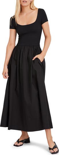 Deeply scooped necklines artistically frame a short-sleeve fit-and-flare dress balancing a soft ponte-knit bodice with a flowy cotton-poplin skirt.
