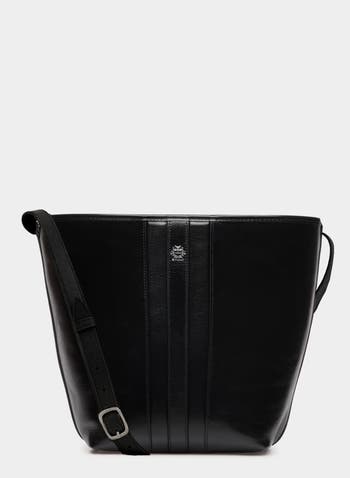 This Signature bucket bag is designed in black buffalo leather and finished by Bally signifiers: a subtle inlay Ribbon in matching leather and the Bally family Crest in gold-tone foil. A detachable zip pouch is found on the inside.