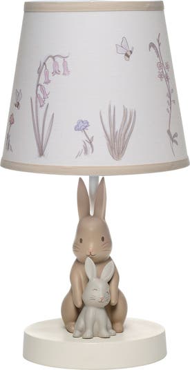 Add a soft glow to your child’s room with this custom hand-painted 3-dimensional lamp with shade. An adorable mommy bunny in a taupe color is snuggling with her silver-gray baby bunny. The lamp with shade is approximately 14 ½ inches in total height. The lamp shade is on a cream color ground with pastel wildflowers, plants, and butterflies. Requires a 9 Watt LED Bulb which is not included.
