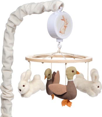 - Two high pile minky bunnies and two woven poplin mallard ducks decorate this charming musical mobile