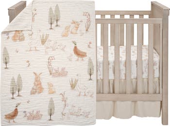 - All-natural 3-piece crib bedding set includes one organic cotton muslin coverlet, one organic cotton muslin fitted crib sheet, and one shirred cotton linen crib skirt