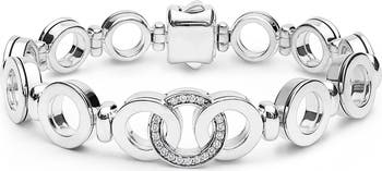 A pavé diamond–adorned center link brings icy sparkle to this stunning bracelet crafted from interlocking circles made of polished sterling silver.