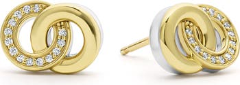 Polished goldtone and diamond-paved circles interlock at the focal point of these signature stud earrings made of sterling silver and 18-karat gold.