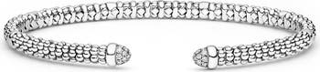 Signature Caviar beads of sterling silver shape this luxe cuff bracelet illuminated with pavé diamonds caps.