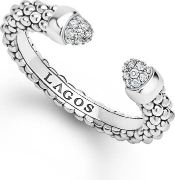 Signature Caviar beads of sterling silver shape this luxe open ring illuminated with pavé diamonds caps.