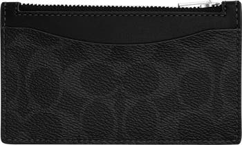 A logo monogram pattern provides an eye-catching contrast to the smooth, rich leather of this slender card case equipped with an array of pockets to secure your cards and coins. A convenient clip serves to easily attach keys or charms to this luxe holder.