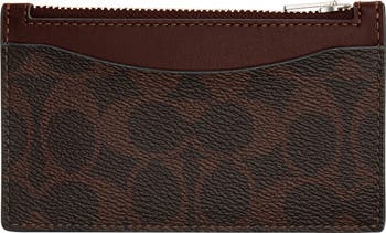 A logo monogram pattern provides an eye-catching contrast to the smooth, rich leather of this slender card case equipped with an array of pockets to secure your cards and coins. A convenient clip serves to easily attach keys or charms to this luxe holder.