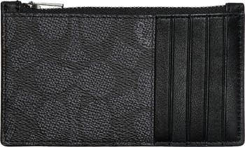 A logo monogram pattern provides an eye-catching contrast to the smooth, rich leather of this slender card case equipped with an array of pockets to secure your cards and coins. A convenient clip serves to easily attach keys or charms to this luxe holder.