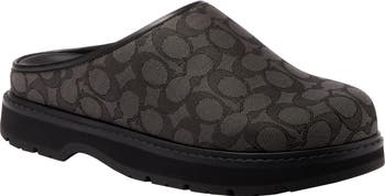 Smooth leather trims and signature logo jacquard create textural interplay on an easy slip-on clog grounded by a rubber lug sole.