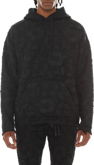 Raw edges and an intricate lace overlay add a dark edge to this pullover hoodie made from midweight 550-gram French terry.