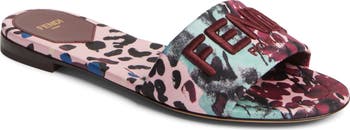 A richly embroidered logo stands out against the spot-splashed calfskin leather of this Italian-crafted slide sandal.