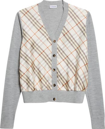 Whisper-light silk panels covered in the iconic check motif contrast the fine-gauge wool-blend body of this mixed-media cardigan.