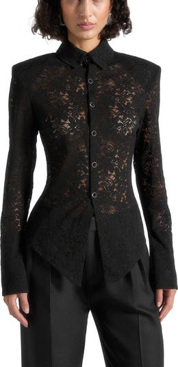Defined by an angled hemline and soft flared sleeves, this piece blends bold structure with refined detailing. Crafted from a high cotton blend with delicate lace fabric, it delivers a refined, textural finish. Statement feature buttons add an elevated accent, while padded shoulders enhance the wide shoulder silhouette for a confident, statement shape. Finished with a smooth satin lining, it balances elegance with a contemporary edge.