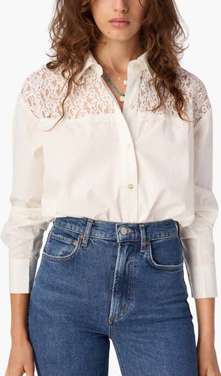 A floral lace yoke adds a touch of modern romance to this button-front shirt fashioned from crisp cotton poplin.