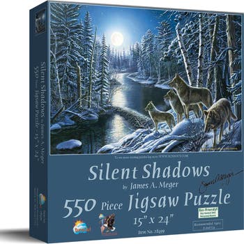 Unleash your creativity with the Silent Shadows 550 Piece Jigsaw Puzzle, showcasing the serene winter wilderness by James Meger. Measuring 15" x 24" when complete, this puzzle captures the breathtaking allure of a moonlit winter night with a family of wolves. Crafted for adults, it provides a challenging yet rewarding experience. Precision and quality are guaranteed with SunsOut Puzzles, known for their securely interlocking pieces. The puzzles are made with high-quality recycled cardboard, and the process is easy and smooth, enhancing your puzzling experience. SunsOut, proudly made in the USA, assures exceptional manufacturing standards and a robust commitment to customer satisfaction. Their eco-friendly approach involves sustainable craftsmanship, demonstrating a commitment to preserving the planet using soy-based inks and recycled board. As part of a woman-owned small business, your purchase supports ethical practices that prioritize environmental responsibility and artistic integrity. Each puzzle arrives in a large, full-color display box, perfect for gifting puzzle enthusiasts or nature lovers. Fully licensed by renowned artists like James Meger, these puzzles are akin to pieces of art that deserve showcasing. Experience the enchanting world of Silent Shadows and the magic of James Meger's art, promising a rewarding journey of imagination and discovery, spent solo or shared with loved ones.