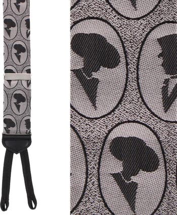 A study in timeless elegance, the Silhouette Cameo Novelty Silk Formal End Braces pay homage to the refined artistry of classical portraiture. Woven in lustrous silk, each strap features delicately framed cameo silhouettes in striking black against a soft silver-grey ground, a design that evokes heritage, romance, and understated sophistication. Perfectly suited to formal attire, these braces blend vintage inspiration with contemporary tailoring, offering a distinguished finishing touch to eveningwear and ceremonial dress. A distinguished accessory for the gentleman who appreciates heritage design and quiet refinement, where classical art meets modern formalwear. Features a 35mm width and adjustable length (33 - 48 inches) to ensure a tailored fit and all-day comfort.