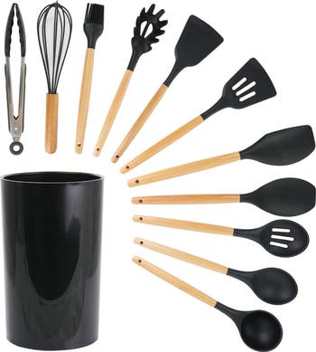 - Includes: Ladle, Spatula, Turner, Spoon, Slotted Turner, Slotted Spoon, Pasta Spoon, Spatula Turner, Brush, Whisk, 9 Inch Tong, Plastic Canister