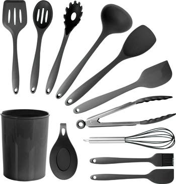 - Includes: 9 Inch Tong, Brush, Slotted Turner, Small Spatula, Slotted Spoon, Spatula, Pasta Spoon, Spatula Turner, Ladle, Whisk, Spoon Rest, Plastic Canister