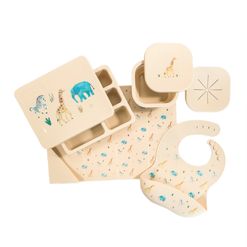 - Silicone Mealtime Bundle with Lunch Bag includes: I Silicone Bento Box with five individual, leak-proof compartments I Adjustable Silicone Bib with deep catch pocket and soft neck collar that grows with your child I Foldable Travel Silicone Placemat with built-in corner pocket for compact, no-bulk storage I Collapsible Silicone Snack Bowl with flat lid and snack lid—can also be used without a lid I Coordinating Insulated Lunch Bag made from recycled materials Lunch Bag features spacious interior, front zip pocket, exterior water bottle holder, and adjustable/removable shoulder strap I All silicone items are crafted from 100% food-grade silicone I BPA- and PVC-free for safe everyday use I Dishwasher and microwave safe for quick, easy cleaning I Durable, flexible, and ideal for use at home, daycare, school, or on the go I Designed in the USA with a soft modern color palette and whimsical watercolor illustrations I Makes a perfect gift for baby showers, birthdays, or toddler mealtime upgrades