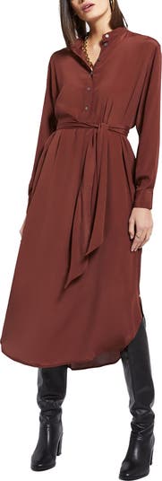 Silk-blend fluid midi dress with sash and rounded bottom.