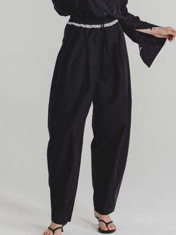 Pleated cotton silk lightweight barrel leg pants with lace trim waist detail.