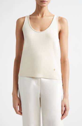 Knit in a fine-gauge jersey stitch, this classic sweater-tank is designed with a deeply scooped neck and accented with a golden brand emblem at the hip.
