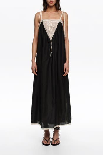 Flared A-line dress in a silk blend. Designed with an adjustable straight lace neckline and tie straps for a delicate finish.