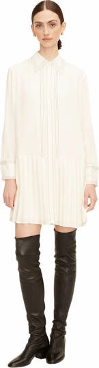 • A morefeminine take on the classic shirtdress, this double silk georgette mini isdetailed with a picot-trimmed collar, cuffs, and contrast black stitching. Model is 5'10" and wearing a size 2/small 100% silk Dry clean only