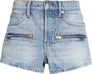 These mid-rise denim shorts are designed with the illusion of silk undies showing above the waistband, reflecting Wang's street aesthetic. An authentic light-indigo wash and horizontal zip pockets at the thigh finish off the edgy look.