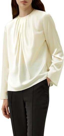 Discover the epitome of luxury and style with our exquisite silk top, where timeless elegance meets contemporary design. Crafted for a universally flattering regular fit, this top is tailored to accentuate diverse body shapes with grace. Its set-in sleeves exude a refined, polished aura, infusing a dose of sophistication into your ensemble. The front features an eye-catching asymmetrical pleat, adding layers of depth and intrigue that captivate and charm, embodying a subtle romantic flair. Designed with a flexible hemline, this top offers dual styling options: tuck it in for a crisp, streamlined look, or leave it untucked to achieve a casual yet chic vibe.