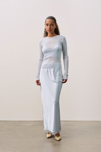 Pure silk pull-on skirt, cut on the bias for fluid movement, featuring a longline silhouette and finished with a tonal organza trim.