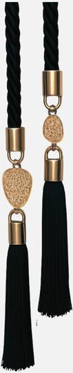 A silky twisted cord belt with a fluid drape and sculptural finish. Gold-tone hammered charms and tassels add movement and a refined edge, designed to cinch dresses, tunics, or tailored layers